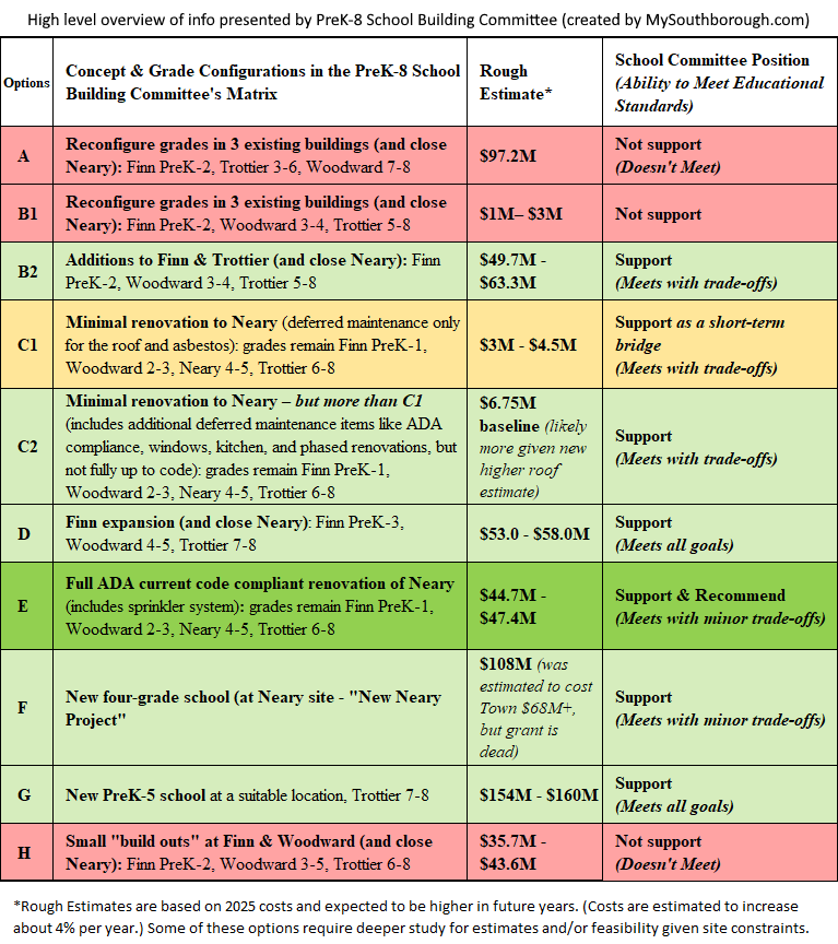 As I previously covered, the School Committee voted to endorse the district leadership’s recommendation of option E, a full, ADA Compliant renovation of Neary School. (With inflation predictors, if constructed in 2026 or 2026, the matrix shows the rough cost estimate is $46.5M – $51.2M.)