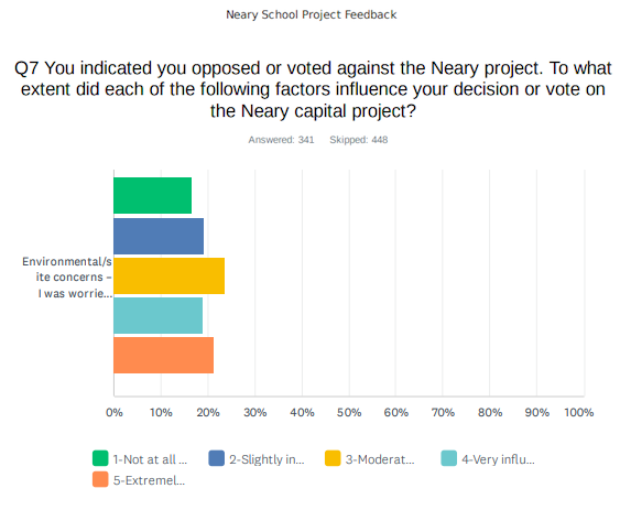 However, Probst’s summary actually only counts the percent of respondents that listed the concern as “Extremely Influential” in their decision making. Adding in “Very Influential” the figure goes up to 40%. Plus, another about 23% listed it as “moderately influential. (See graphs below, from Probst’s presentation and my edited image from the district’s full data report.)