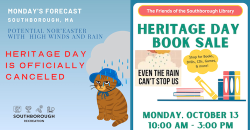 The Southborough’ Library’s Sale will still go on, inside the library from 10:00 – 3:00 pm.