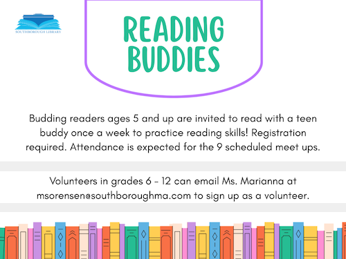 The Southborough Library is bringing back a literacy program introduced last spring spring for beginner readers ages 5 years and older. The program partner kids with teen “Buddies” for six weeks, to encourage early readers.