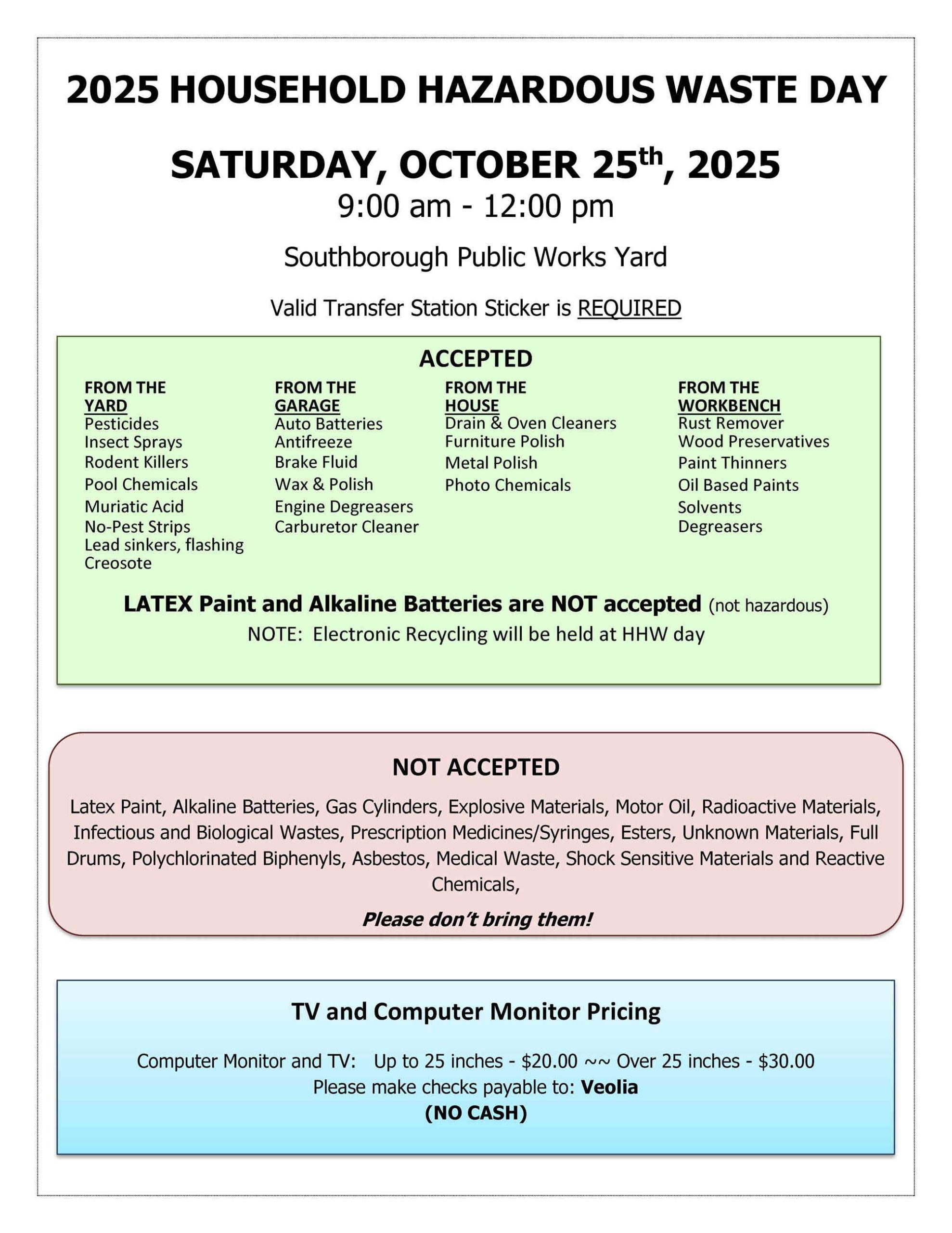 Southborough’s annual day for residents to rid themselves of “Household Hazardous Waste” is a week from tomorrow. While disposing of the specified items is free, the event is limited to those who have current, valid Transfer Station permit stickers.