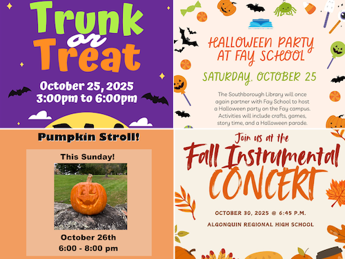 Hazardous Waste Day, Library/Fay Halloween Party, Trunk or Treat, Pumpkin Stroll, Special Town Meeting, Shelf Help, and more