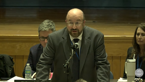 Above: The Moderator recused himself for moderating discussion of an Article that would have created a new committee appointed by him, telling voters he was fine with whatever they decided. (image from meeting video)