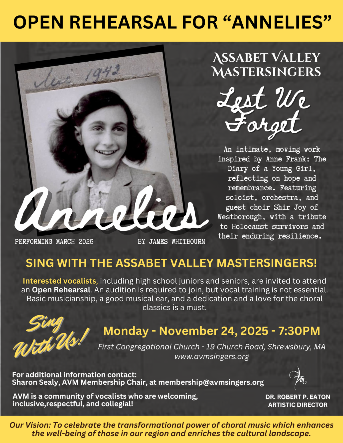 Updated (11/14/25 9:30 am): Those interested in AVM might also be interested in joining them. The group is advertising that it will hold its next Open Rehearsals and audition opportunity on Monday, November 24th. They will be rehearsing for their March concert “Annelis”. You can read about that in the flyer right.