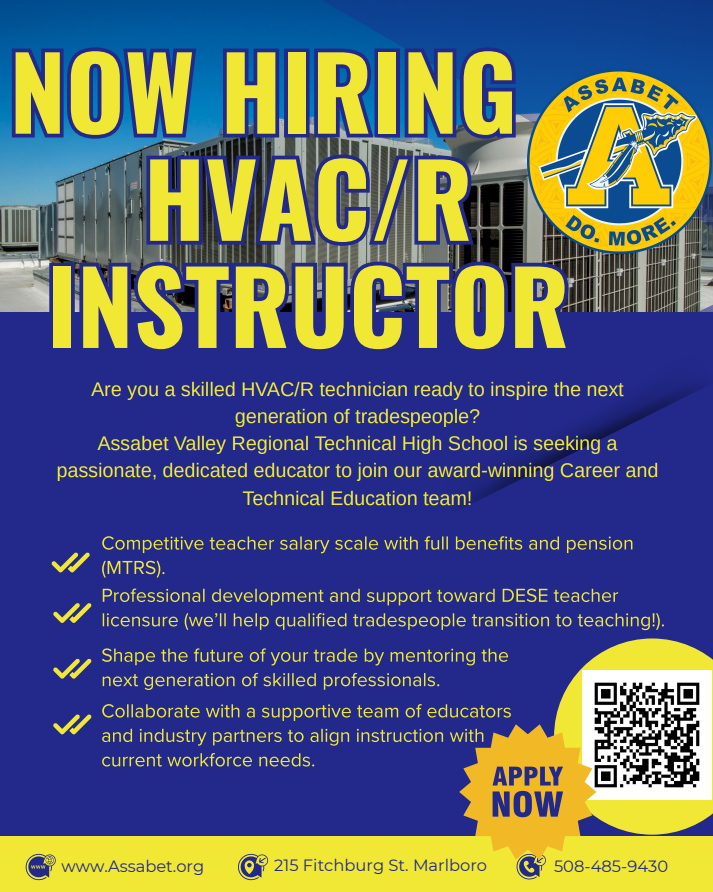 According to Assabet Valley Regional Technical High School’s flyer, they will “help qualified tradespeople transition to teaching” for the full-time teacher job.