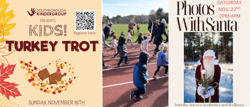 - Photos with Santa to benefit local organizations (2:00 – 4:00pm) @ Aurora Aesthetics and Wellness Center, 54 Central St: The event is free, but community members are encouraged to make a donation to Southboro Free Fridge & Project Just Because. For details, see dedicated post.