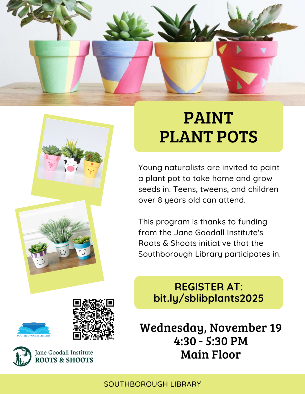 This Jane Goodall Institute’s Roots & Shoots initiative program will invite participants paint pots to take home and plant seeds in. (Click here to register.)