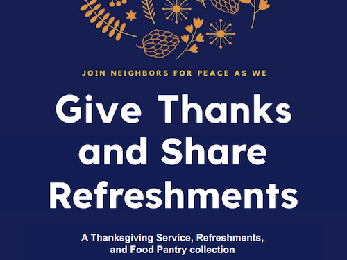 I have more Early Thanksgiving news. Next week, the public is invited to again join Neighbors for Peace at a Thanksgiving inspired gathering. But don’t expect a full Thanksgiving meal.