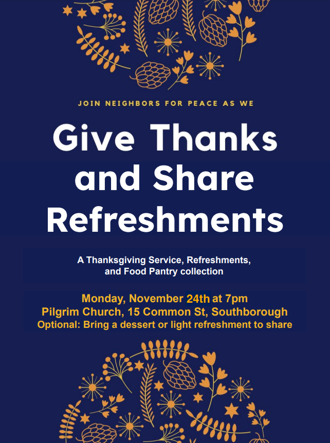 I have more Early Thanksgiving news. Next week, the public is invited to again join Neighbors for Peace at a Thanksgiving inspired gathering. But don’t expect a full Thanksgiving meal.