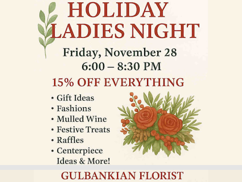 Above: Gulbankian Florist is promoting its annual holiday open house with special details this year. (image edited from flyer)