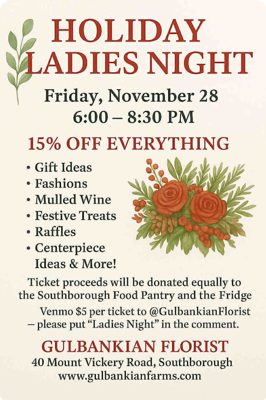 Gulbankian Florist’s will collect $5 admissions to its Holiday Ladies Night. Those proceeds will be split between the Southborough Food Pantry and the Free Fridge.