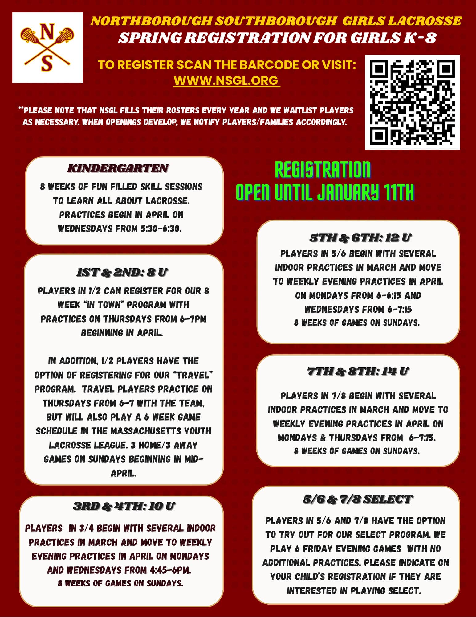 NSGL is promoting its deadline for sign up of January 11th. But they also warn that registration fills up with a waitlist each year. So, I wouldn’t risk waiting too long to sign girls up.