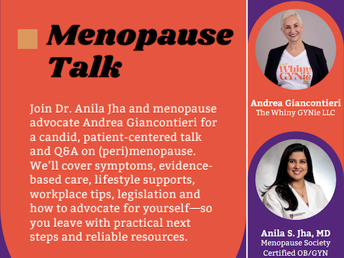 For next week’s event, she’s joined by Join Menopause Society Certified GYN-Dr. Anila S. Jha.
