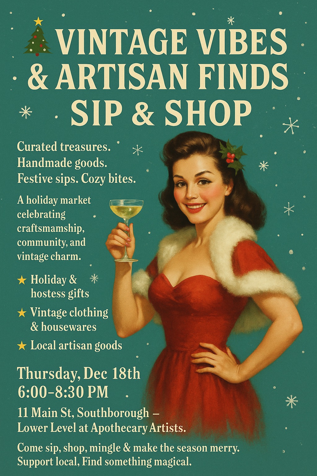 Come sip, shop, mingle & make the season merry. Support local, Find something magical.