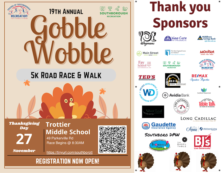 Friends of Recreation’s 19th annual fundraiser featured a 5K timed race with a 2 mile family-friendly walk on Thanksgiving morning. This year, the Friends boasted a record breaking number of registrants — 1,208 runners and walkers! The event was made possible by a good group of volunteers and sponsors (see image right).