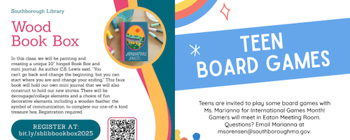 - Wood Book Box (11:00 am – 1:00 pm) @ Southborough Library: Registration is required for this free program for kids ages 12 through adults. Participants will create and decorate a faux book. For details, see related post.