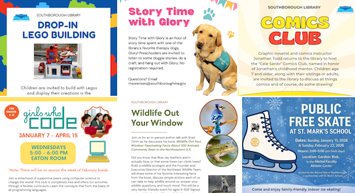 - Open Skate (3:00 – 5:00 pm) @ St Mark’s School, Gardner Rink: Southborough Rotary and St. Mark’s School are hosting this free drop-in ice skating session for all ages, featuring hot chocolate, donuts, and music. Donations to the Southborough Food Pantry are encouraged. For details, see dedicated post.
