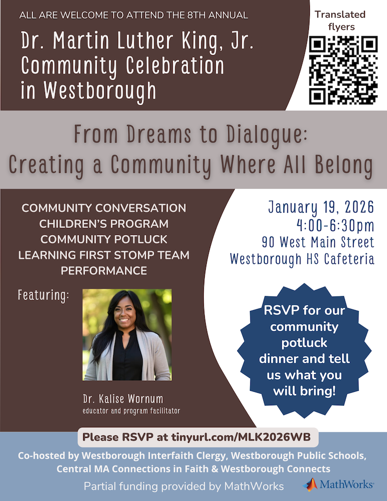 Local residents of all ages from communities across the central MA and MetroWest region are invited to come together to honor Dr. King’s legacy. We will focus on how to live Dr. King’s dream today through dialogue that promotes belonging for all.