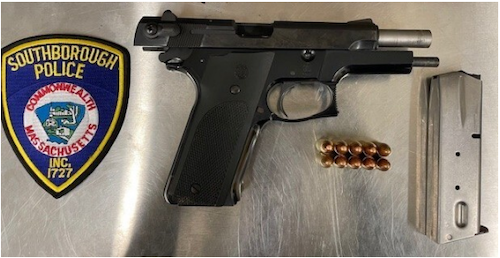 Above: “Following a traffic stop, Southborough Police located a loaded and unregistered handgun. The driver was arrested and faces gun-related charges. (Photo Courtesy Southborough Police Department)”