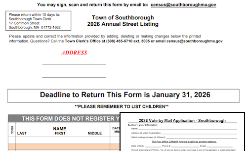 The “Annual Street Listing” form was mailed to Southborough residents earlier this month.. (It’s also referred to by officials as the Town Census.) Completed forms are requested back within 10 days and officially due back by January 31st.