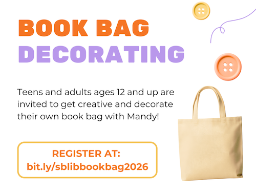 Book Bag Decorating flyerThe focus is an appropriate one for a library to host — “Book Bag Decorating”.
