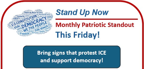 The public demonstration will again feature using signs (and flags) to promote an anti-authoritarian message. This month, a message to email subscribers invites them to “Join with us and Minnesota” in response to actions by ICE (U.S. Immigration and Customs Enforcement).