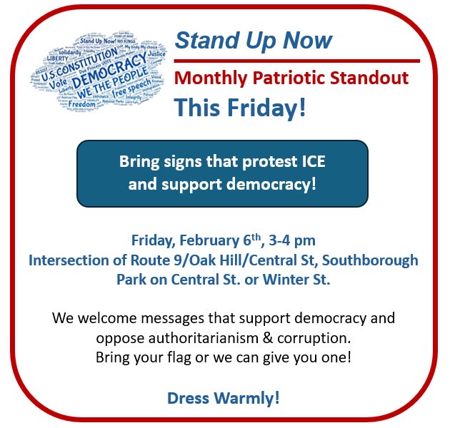 The Southborough-based “pro-democracy group” Stand Up Now (SUN) has scheduled its monthly “Patriotic Standout” at a busy intersection on Route 9.