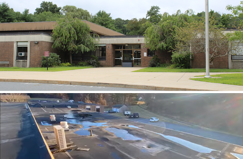 Above: The Select Board and School Committee discussed their plans to ask voters to address the school buildings’ short term needs (mainly Neary’s roof) and potentially longer term projects. (images from school website and roof report)