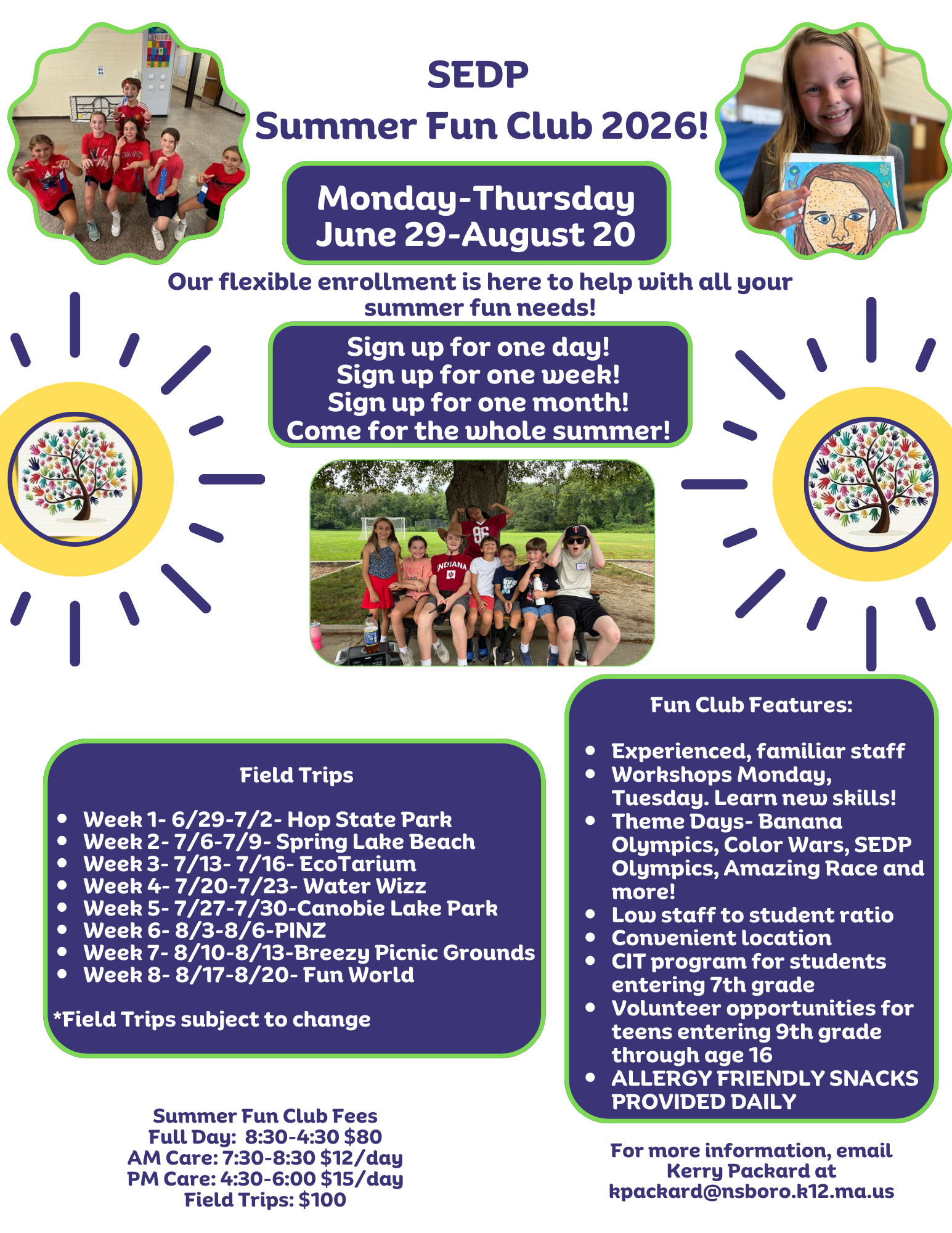Summer Fun Club 2026 flyerThe SEDP program, managed through a partnership of community parents and the public schools, is only available for kids entering grades K-6. And it only runs Mondays – Thursdays.