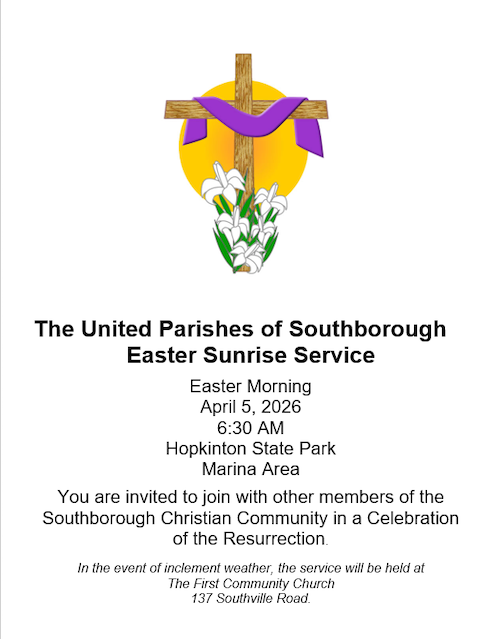 UPS Sunrise Easter Service flyer 2026On Sunday, April 5th, Easter morning, the United Parishes of Southborough will hold their annual Easter Sunrise Service. (No registration is required to attend.)