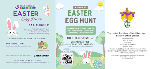 Kindergroup Egg Hunt flyerAs I noted in a prior post, Southborough Kindergroup’s free community Easter Egg Hunt will take place on Saturday, March 21st at 10:00 am. This year, it’s moving to the outdoor track area next to Trottier Middle School (49 Parkerville Road). The rain date is Sunday, March 22nd. (Though, it’s nice to know they have some extra wiggle room if the weather doesn’t cooperate that weekend.)