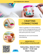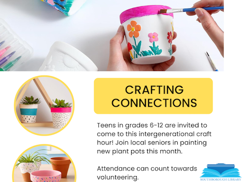 The Southborough Library is hosting an intergenerational “Crafting Connections” event a week from Saturday. Registration is open for Teens in grades 6–12.