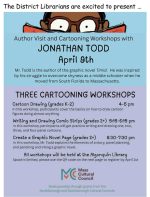 Above: School librarians are bringing in an author/illustrator to help kids learn or improve their skills drawing cartoons/graphic novels. (images cropped from flyer and Todd’s promo photo)