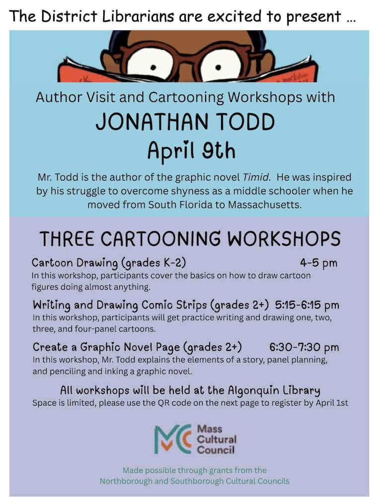 For those not familiar with Todd, he is an author/illustrator whose work is inspired by his own childhood experiences. He has experience working with kids (in Southborough and elsewhere) to help them tap into their own experiences and imagination to create cartoons/graphic novels.