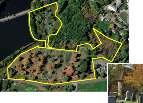 Above: A committee will look at expanding the Rural Cemetery and a new potential use for a unique feature on the existing parcel. (images edited from GIS Maps and Google Street maps)