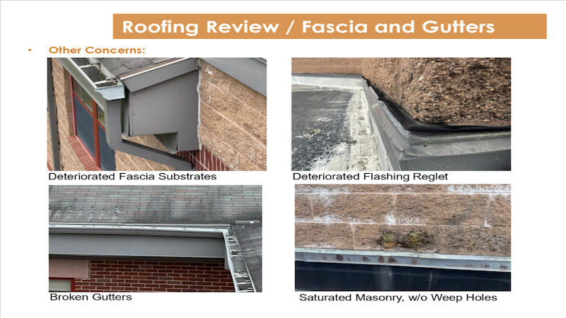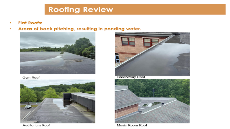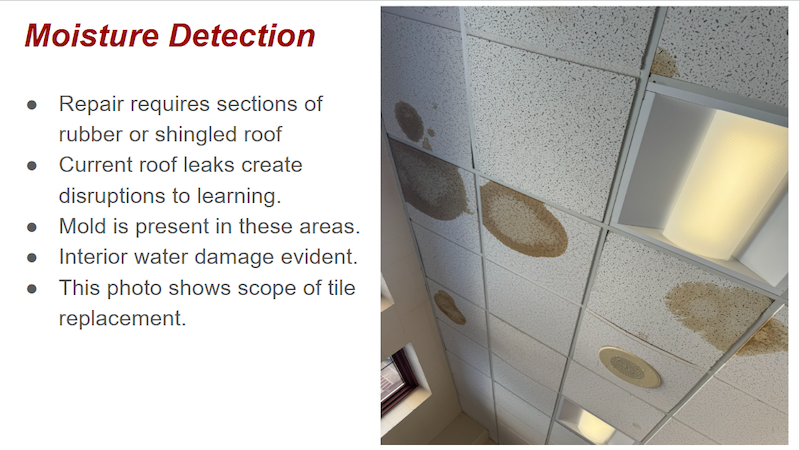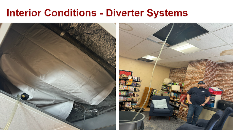 Lavoie’s presentation featured images and details of the roof problems and indoor impacts, including leaking and mold. It also demonstrated an example of the building staff’s creative work to grapple with the problems using a “diverter system” of tarps to drain leaks: