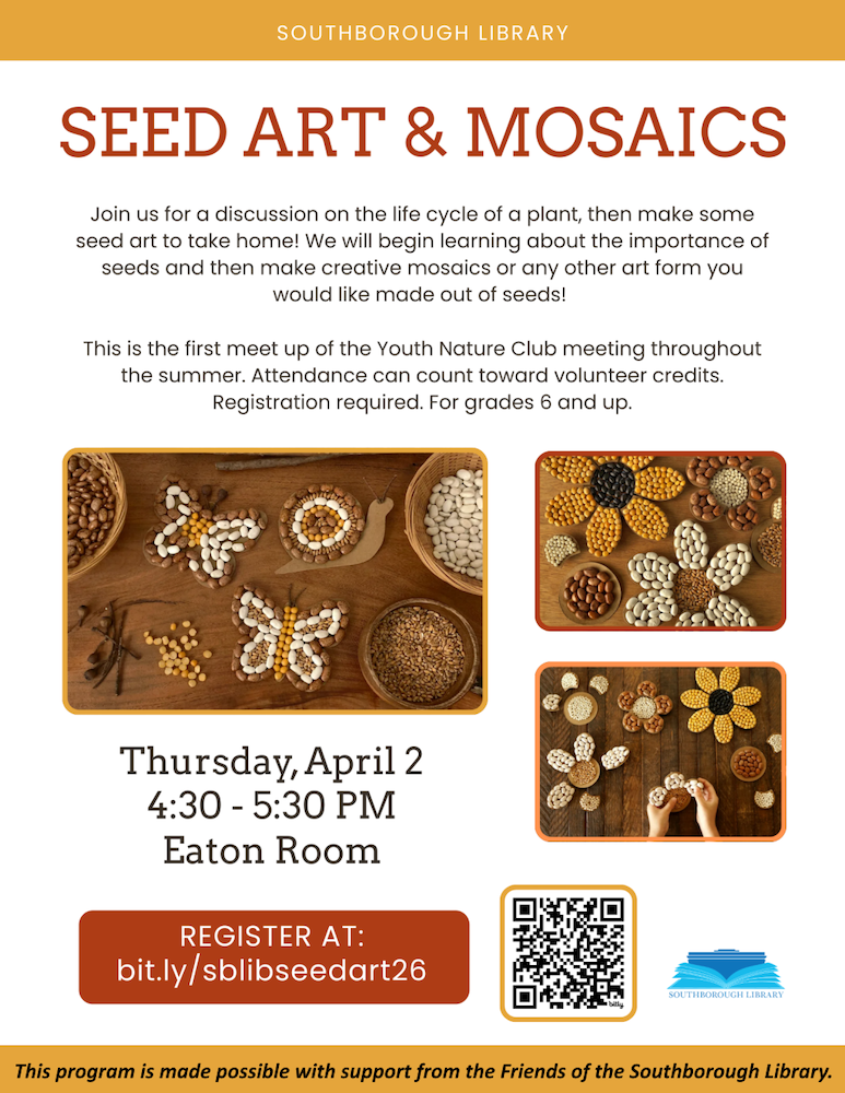 Seed Art flyerKids in grades 6+ are invited to the special event on Thursday, April 2nd, 4:30 – 5:30 pm: