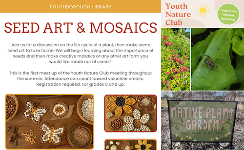 Above: The library is resuming a club of young volunteers that explored and tended its gardens last year. The first meeting will include a guided art project. (images cropped from flyer and library Facebook posts)