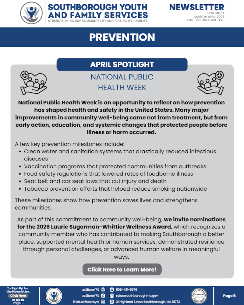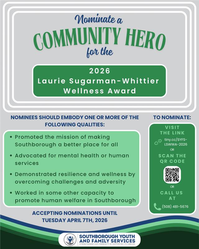 As part of this commitment to community well-being, we invite nominations for the 2026 Laurie Sugarman-Whittier Wellness Award, which recognizes a community member who has contributed to making Southborough a better place, supported mental health or human services, demonstrated resilience through personal challenges, or advanced human welfare in meaningful ways.