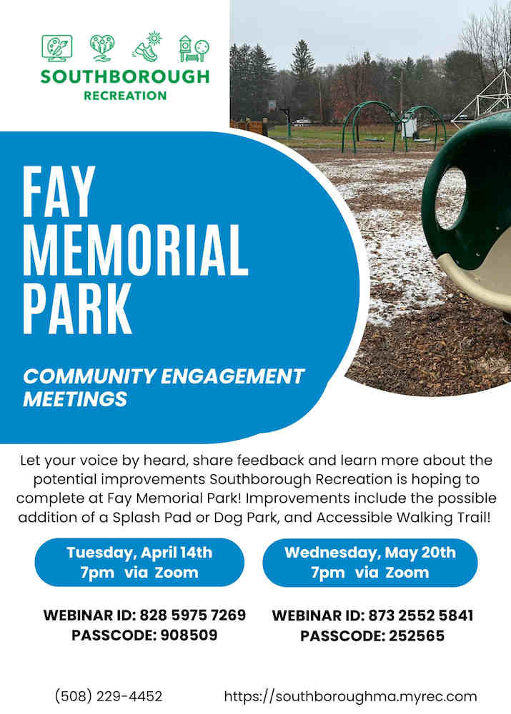 Let your voice by heard, share feedback and learn more about the potential improvements Southborough Recreation is hoping to complete at Fay Memorial Park!
