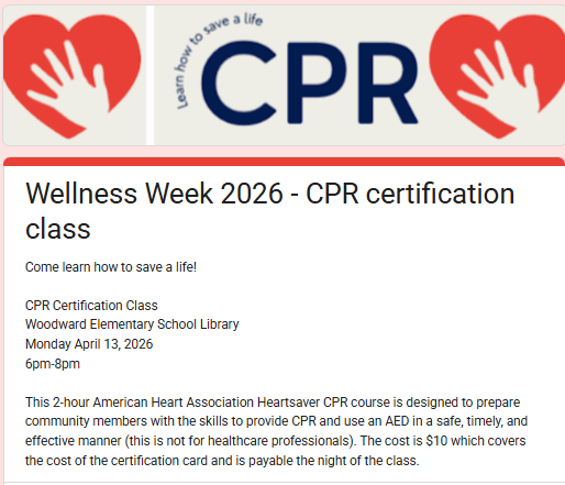 CPR certification course (6:00 – 8:00 pm) @ Woodward Library: Come learn how to save a life! Woodward Library ($10 fee, pre-registration required here)