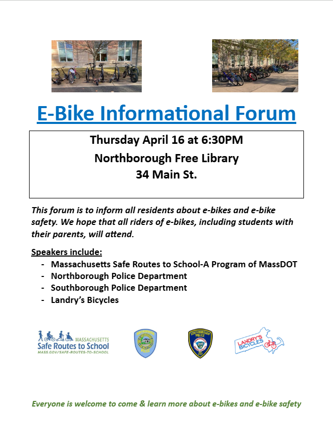 - E-BIKE presentation (6:30 – 7:30 pm) @ Northborough Library: Join Safe Routes to School, Landry’s Bike Shop, and local police to learn about e-bikes and e-bike safety. They hope that all riders of e-bikes, including students with their parents, will attend.