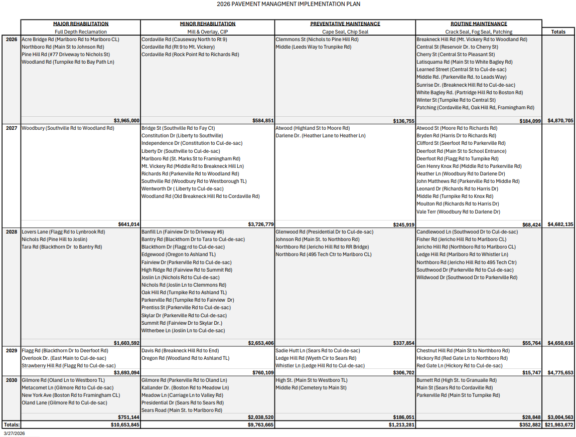 For readers who may be surprised that Cordaville Road and Framingham Road are only on the list for minor road work, there’s a reason for that. According to Cundiff, those are on the Mass Dept of Transportation’s TIP (Transportation Improvement Program) list. That means the state will pay to repair those roads, but not until after 2031/2032. The work in the Town’s road plan is to improve their condition in the meantime, since “they’re in such poor shape”.