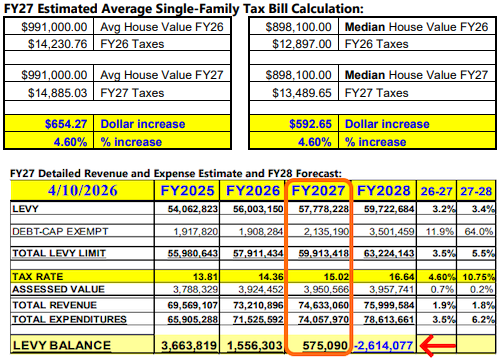- I reached out to Advisory member Andrew Pfaff about why the home values were the same for FY26 & FY27. He explained that Finance Director and the Assessor believe that real estate values will be relatively flat. More importantly, if home values rise, they expect that commercial properties will also go up at about the same rate. That means the tax impact to homeowners wouldn’t need adjusting.