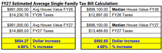 Above: Advisory’s report to Town Meeting recommends voters approve the proposed FY27 budget, plus spending & borrowing Articles, despite a projected 4.6% tax increase and a warning about a looming financial challenge next year. (images edited from report.)