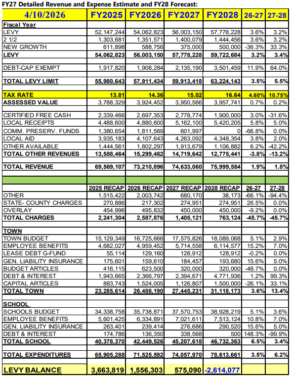 The warning about next year may evoke a feeling of déjà vu. Last year’s report came with a similar warning about a “Likely future Proposition 2 ½ Tax Levy Override and Budget Forecast” for FY27 by about $1.3M. This year, the Town’s excess Free Cash of over $1M helped them avoid the issue.