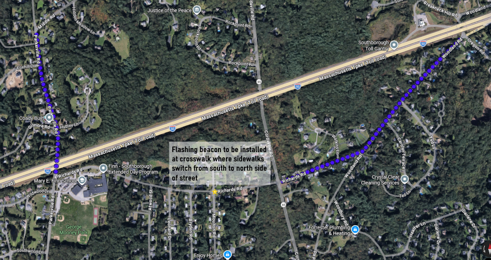Cundiff specified that those sidewalks will be concrete with curbs. And he noted that a crosswalk on Richards Road will include a flashing beacon. (From prior communications, one is planned for the area where sidewalks switch from the south side of the street to north side of the street, at Moulton St & Killam Farm Rd.)