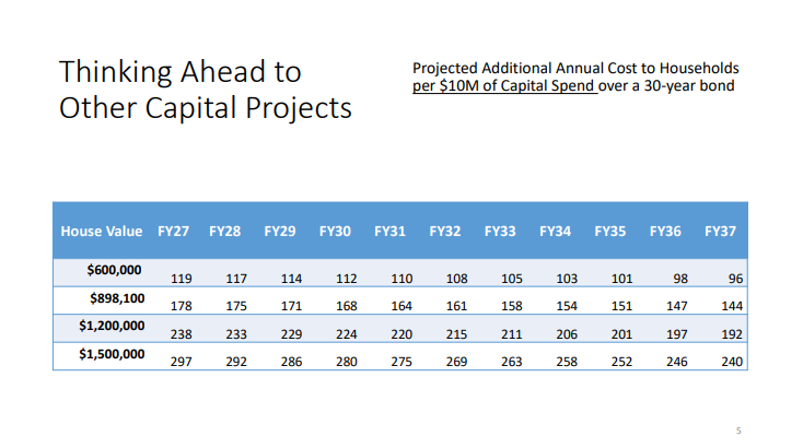 Ballentine also shared the cost that would be added for every additional $10M of borrowing if other capital projects are approved in the future. (Like a big Neary renovation project.) The table is the cost per household for every $10M of borrowing. (So multiply it by 5 for a $50M project, etc.)