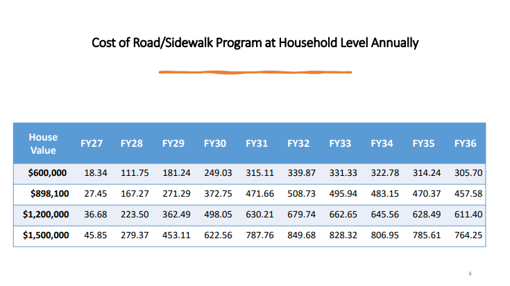 Town Treasurer Brian Ballentine acknowledged that his role in the meeting was to share the bad news. He focused on the Town’s debt landscape. He noted that debt is currently low. If approved, the road and sidewalk projects are forecast to add debt payments that peak in 2032. He presented (right) the impact for homeowners with varying house values.