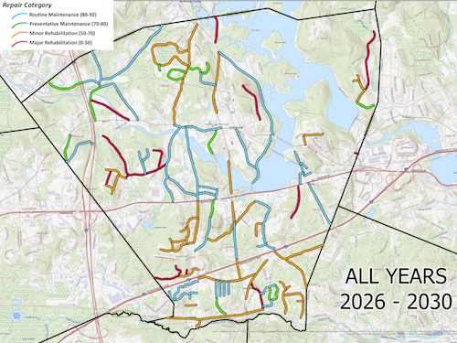 Cundiff used the road scores to create a 5-year road plan, but it wasn’t the only factor. He prioritized highly travelled roads. And, to get started quickly, the first year only includes Major Rehab of roads that don’t have underlying drainage issues. By pushing more complicated jobs to years 2 to 5, it gives the DPW time to do the advance prep work to be ready in those project years.
